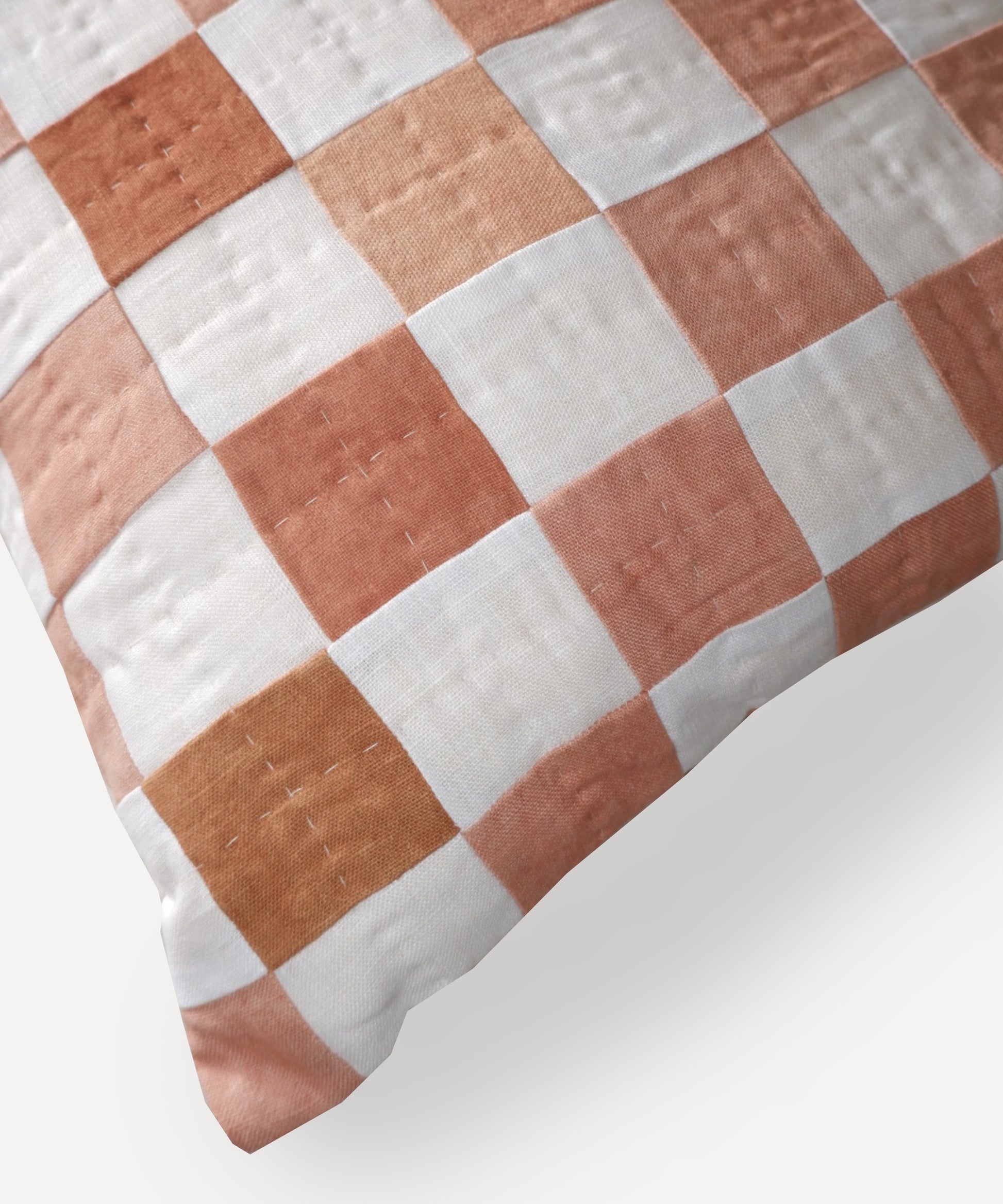 "Tierra Roja" Handmade patchwork terracotta chequered cushion, featuring a hand-quilted grid detail and finished with wooden buttons in the back. Filled with an ethically sourced feather insert.